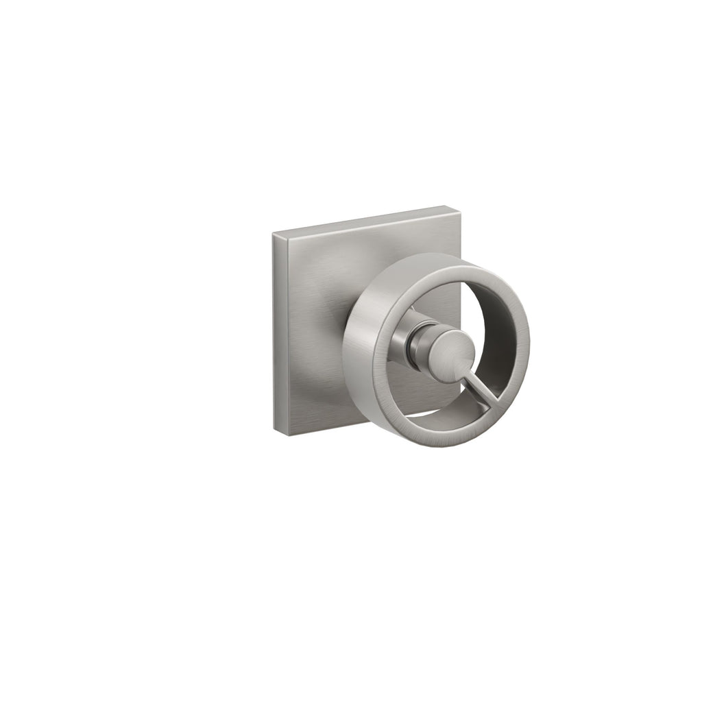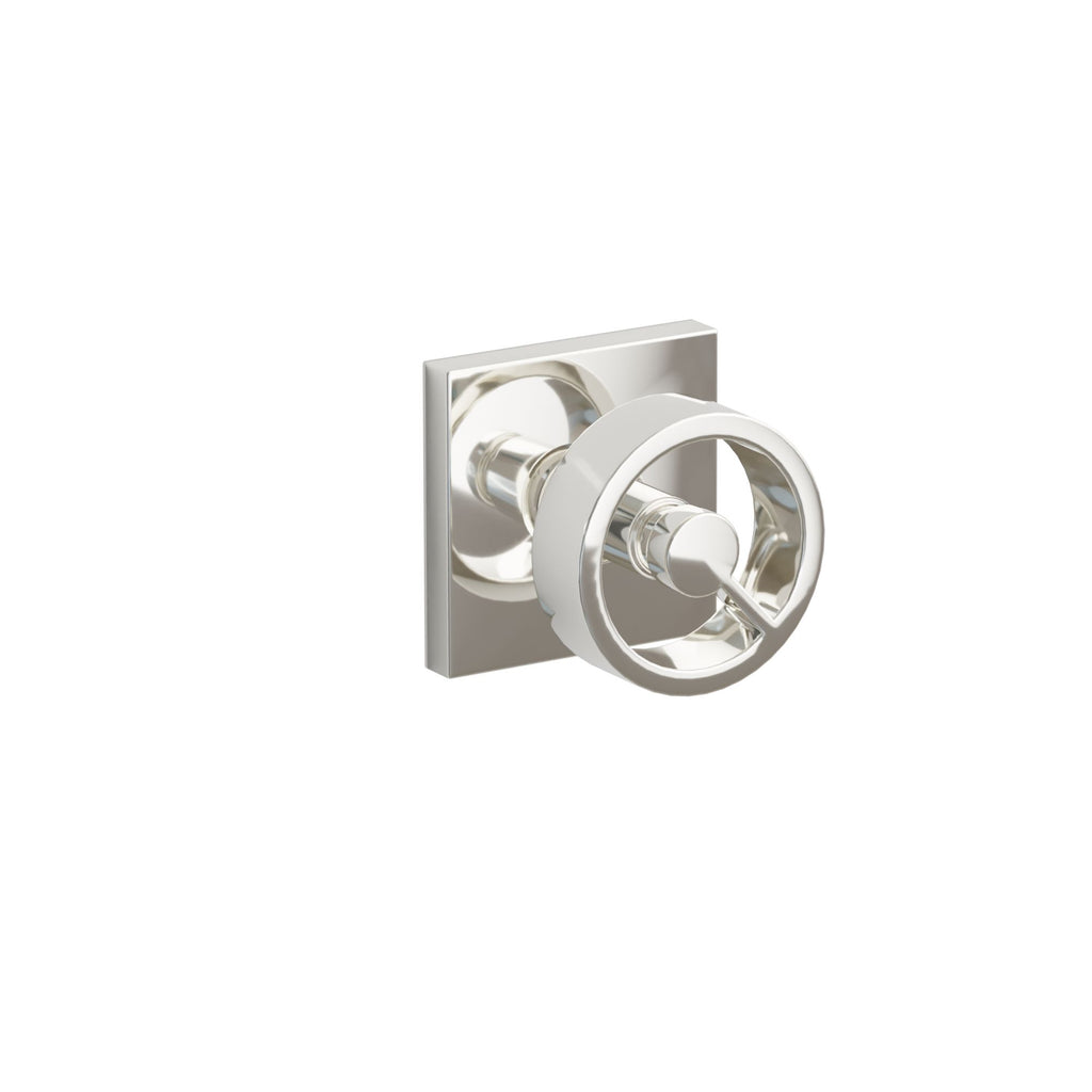 About the Emtek Spoke Knob Set with Square Rosette - The Spoke knob deconstructs the concept of traditional door hardware by stripping away excess material, leaving a single spoke to bridge the body of the knob with its base. Minimal and sophisticated, the hollow ring design is interrupted by a singular rung, attaching it to the central rod and providing an understated and slightly unexpected detail. Intended for modern interiors, with its pared-back look Spoke will add a refined element in more rustic or traditional settings as well.