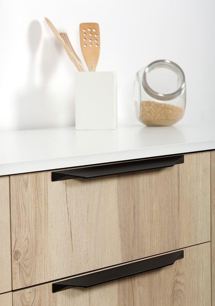 The aluminium Cutt handle has been designed for use in large kitchens and office kitchens that are visible from living or dining room areas. The Cutt is a development of the Tamm model in a more minimal version. It has a modern, robust shape, and is highly functional. It is ideal for installation near door edges or in the usual, centred position of contemporary handles. Available in polished chrome, stainless look and matt black finishes.