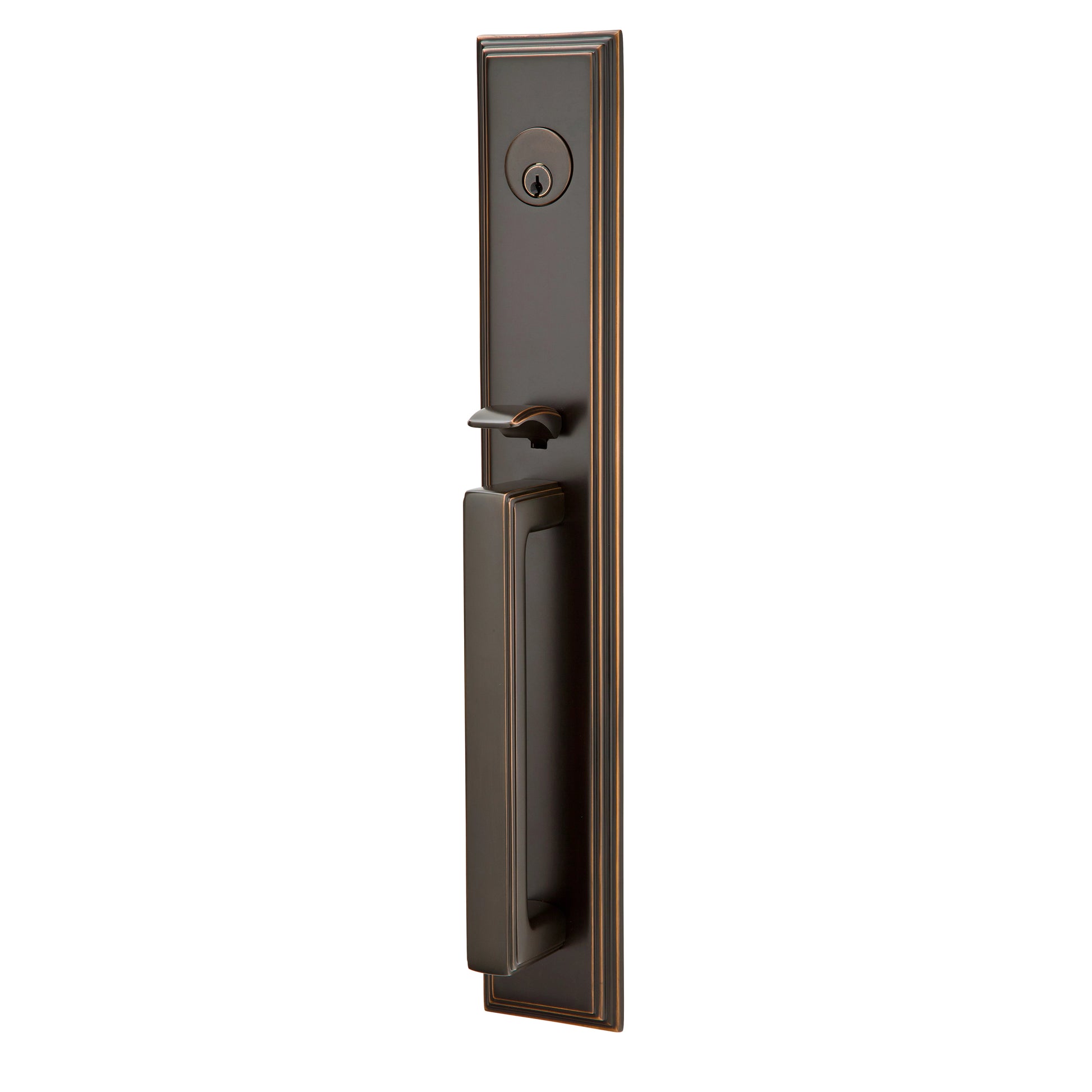 The Melrose Entry Set utilizes a squared grip with a stepped edge detail. She's modern in shape but transitional up close and pairs perfectly with the Wilshire rosette and deadbolt, Wilshire Sideplates and our classic, traditional knobs and levers. While its name--like the similar Wilshire styles--is a nod to Emtek's home base of Los Angeles, the Melrose provides a time-honored look that is perfect for any location from sea to shining sea.