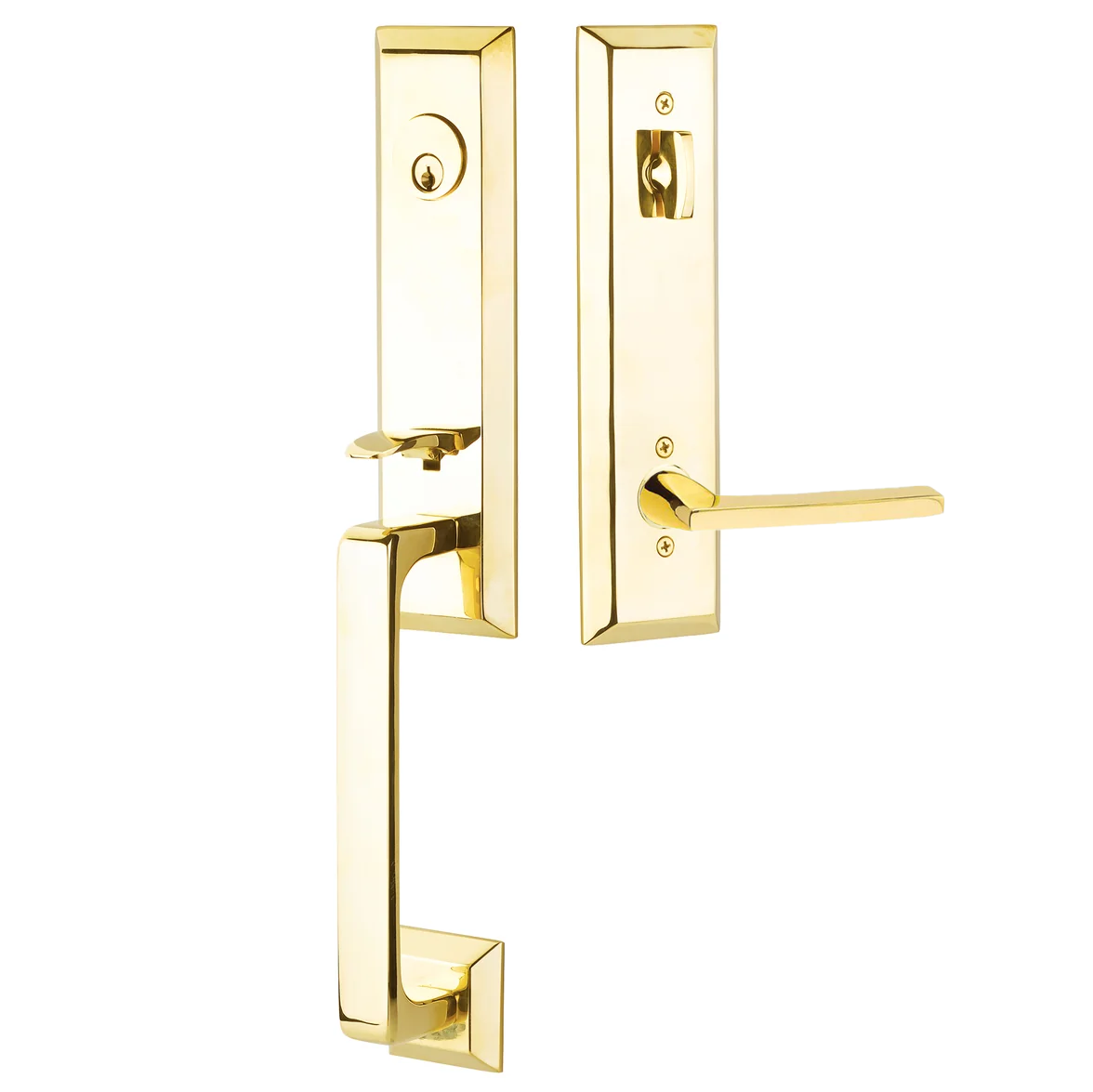 Sold as complete set. Includes: One Thumbpress Assembly w/ Grip and Backplate; One Knob/Lever assembly w/ Backplate; Installation Hardware; Door Prep Template. Cylinder Sets will also have Two 55-degree Latches; Strike; Keys.